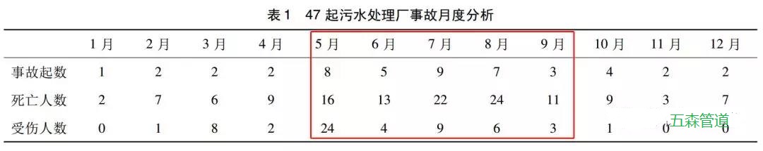 夏季是污水處理廠有毒氣體產生的高峰季節(jié),也是污水處理廠事故高發(fā)的季節(jié),之前作者也建議,不要在夏季去做一些清淤之類的無關生產的小事,可是一些管理人員安全意識淡薄,導致了很多生命的消逝!《我國污水處理廠事故統(tǒng)計分析與對策研究》[1]中統(tǒng)計了10年間的47例污水處理事故并做了分析: