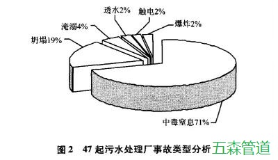 通過對我國污水處理廠事故發(fā)生的類型進行統(tǒng)計和分析可以看出的是污水處理廠事故的類型主要是:中毒窒息、坍塌、淹溺、爆炸、觸電、透水等,而其中最主要發(fā)生的事故類型是中毒窒息事故,發(fā)生的概率是70%。就引起中毒事故發(fā)生的原因來看,硫化氫是引起中毒事故的主要原因,沼氣是引起窒息事故的主要原因。而且中毒事故中容易對工作人員造成人員傷害的主要原因是個人的防護用品失去了效果或者并沒有按照規(guī)定在作業(yè)期間使用防護用品。而且污水處理廠設備出現缺陷、錯誤的操作、設施沒有達到規(guī)定的標準、通風不良等都是造成人員傷亡的原因,但是個人防護用品的使用是引起中毒窒息事故中人員傷亡的主要原因,發(fā)生率高達78%。