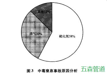 分析研究中分別對中毒窒息的物質進行了統(tǒng)計與分類。結果表明占總事故數57%的是硫化氫引起的中毒事件。占總事故31%的是沼氣引起的中毒事件。其他原因引起的事故占12%,經過分析還可以發(fā)現的是硫化氫引起的主要是中毒事故,沼氣引起的主要是窒息事故。