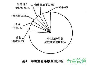 通過對總事故中中毒窒息事故的分析與統(tǒng)計我們可以看出,工作人員的個人防護用品沒有按照規(guī)定檢查失效,以及沒有使用是事故造成人員傷亡的主要原因,占總數的78%,污水處理廠運行的設備有缺陷也是造成事故中人員傷亡的原因之一,占總數的7%。由于通風不良、或者錯誤的操作、在有危險的情況下冒險進入危險場所、物品存放不恰當等這些原因也都是會引起中毒窒息事故的發(fā)生的,就上述情況來看,為了減少中毒窒息對人員傷亡事故的發(fā)生,保證工作人員的防護用品有效、并且正確的使用是關鍵的手段。